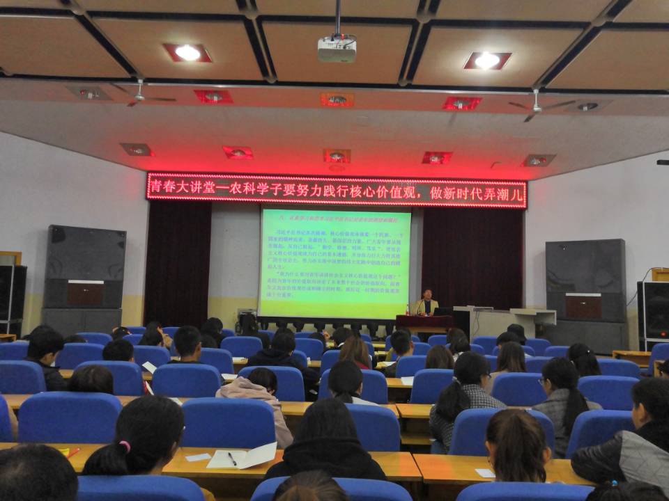 2018年10月22日晚,yl7703永利官网举办了《农科学子要努力践行核心价值观,做新时代弄潮儿》的青春大讲堂专题讲座,学院党委负责人作了专题报告。 150名青年学生参加了活动。